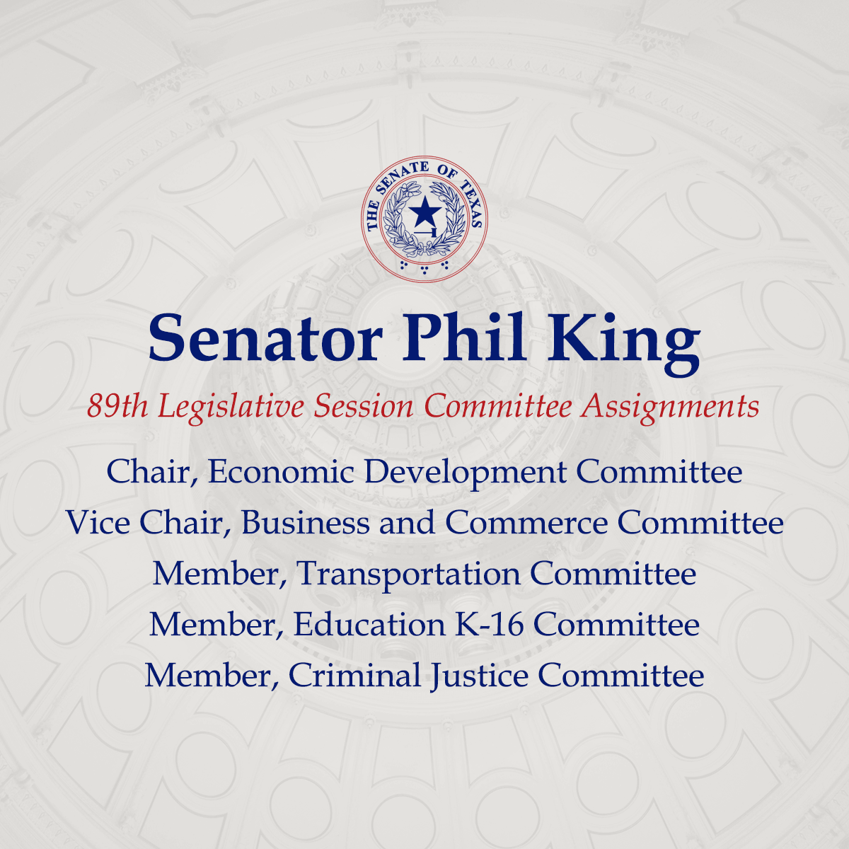 Friday morning, Lt. Governor Dan Patrick announced committee assignments for the 89th Legislative Session. I’m honored with the confidence the Lt. Governor has placed in me as I will Chair the Senate Economic Development Committee and also continue as Vice Chair of the Business & Commerce Committee. Additionally, I’ll serve as a member of the Transportation, Education K-16 and Criminal Justice committees.